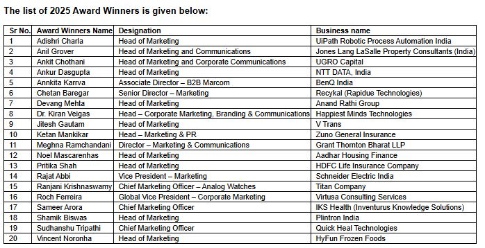 "In today's dynamic business environment, CMOs are no longer just brand custodians--they are growth strategists, technology enablers, and experience architects," said Avinash Gupta, Managing Director & CEO - India, Dun & Bradstreet. "Through the Marketing Mavericks platform, we are proud to recognize the trailblazers who are not only delivering business impact but also reshaping the future of marketing in India."