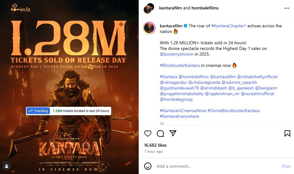 "The roar of #KantaraChapter1 echoes across the nation With 1.28 MILLION+ tickets sold in 24 hours! The divine spectacle records the Highest Day 1 sales on @bookmyshowin in 2025," a post read on the official Instagram handle of Kantara film.
