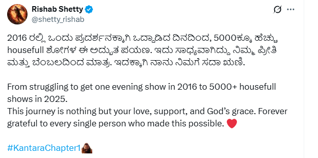 Taking to X (formerly Twitter), he wrote, "From struggling to get one evening show in 2016 to 5000+ houseful shows in 2025. This journey is nothing but your love, support, and God's grace. Forever grateful to every single person who made this possible. #KantaraChapter1."