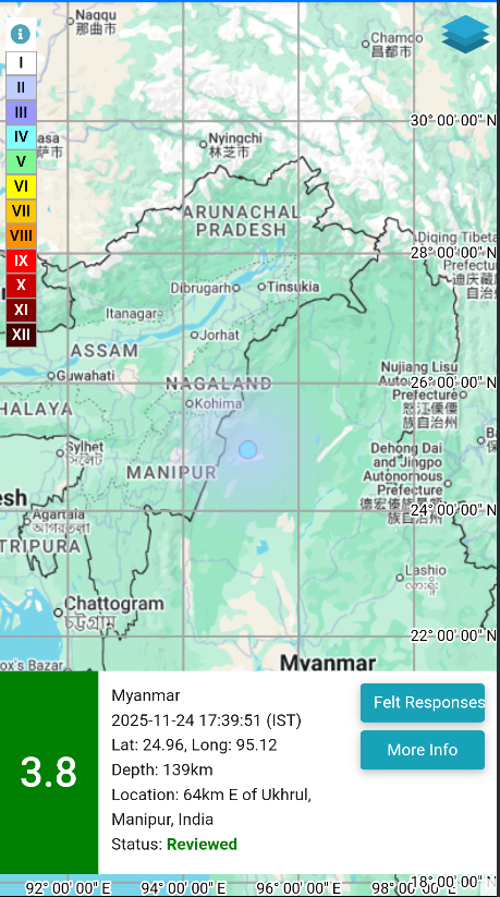 The post read, "EQ of M: 3.8, On: 24/11/2025 17:39:51 IST, Lat: 24.96 N, Long: 95.12 E, Depth: 139 km, Location: Myanmar."