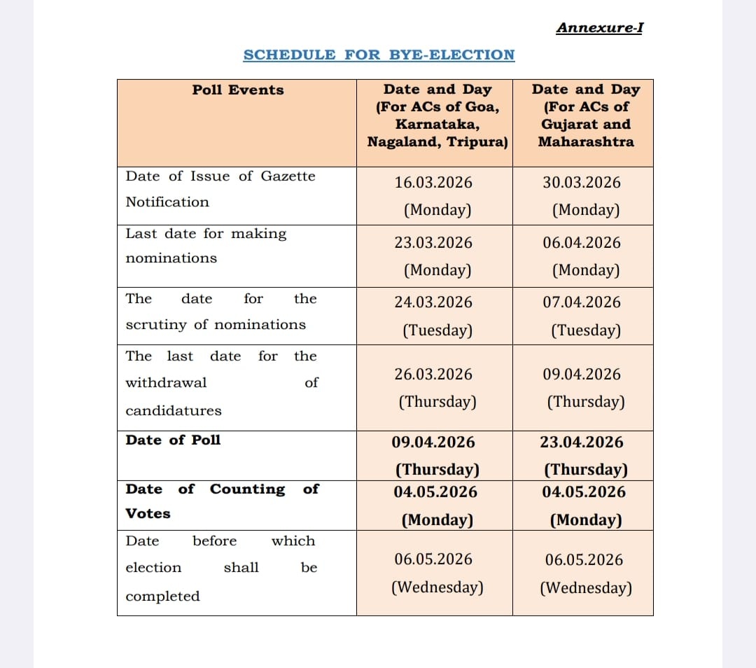 The first phase, covering constituencies in Goa, Karnataka, Nagaland, and Tripura, will have polling on April 9, while the second phase in Gujarat and Maharashtra will take place on April 23.