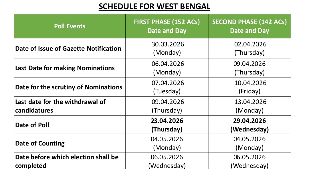 The second phase, covering 142 constituencies, will begin with the issuance of the gazette notification on April 2, 2026. The last date for filing nominations is April 9, while scrutiny will be held on April 10. Candidates may withdraw their nominations until April 13, and voting for this phase will take place on April 29.