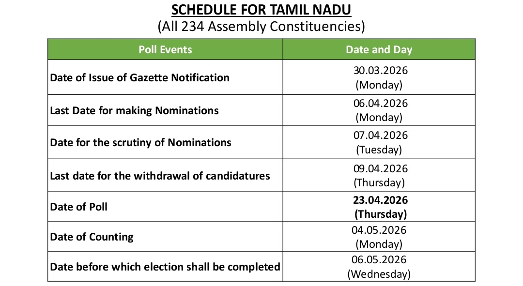Tamil Nadu will hold elections in a single phase on April 23, with counting scheduled for May 4. Addressing a press conference in the national capital, Chief Election Commissioner Gyanesh Kumar said the last date for filing nominations is April 6. Scrutiny will take place on April 7, and the final date for withdrawal of candidatures is April 9.