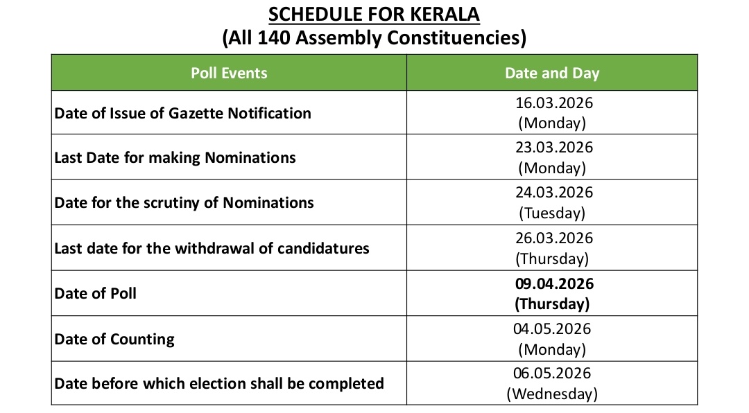 The 2026 Kerala Legislative Assembly election will be held in a single phase on April 9, with vote counting scheduled for May 4. Around 2.7 crore electors are expected to participate in the election. The last date for filing nominations is March 23, scrutiny will take place on March 24, and candidates can withdraw their nominations until March 26.