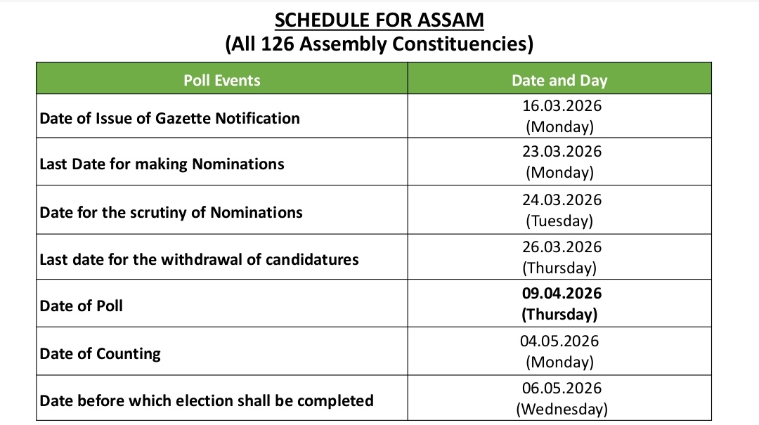 In Assam, elections for all 126 Assembly constituencies will be held in a single phase on April 9, with the counting of votes scheduled for May 4.
