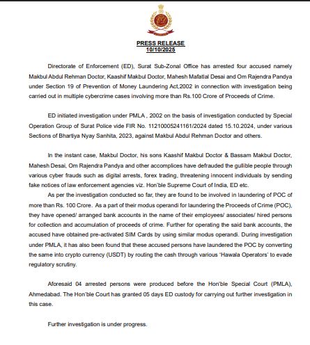 In the instant case, ED said Makbul Doctor, his sons Kaashif Makbul Doctor and Bassam Makbul Doctor, Mahesh Desai, Om Rajendra Pandya and other accomplices have defrauded the gullible people through various cyber frauds such as digital arrests, forex trading, threatening innocent individuals by sending fake notices of law enforcement agencies like Supreme Court of India and ED.