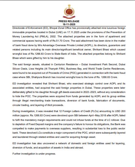ED said its investigation revealed that Shrikant Bhasi, who exercised strategic control over AOPL and its associated entities, had acquired the said foreign properties in Dubai.