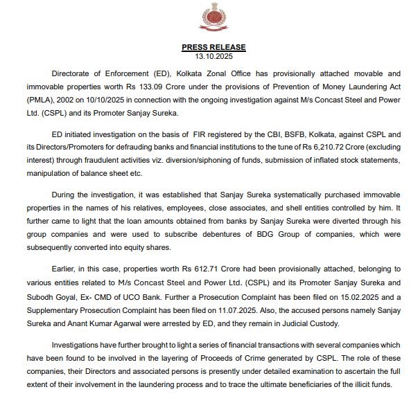 New Delhi [India], October 13 : The Enforcement Directorate (ED) has attached movable and immovable properties worth Rs 133.09 crore in connection with the ongoing investigation against Concast Steel and Power Ltd (CSPL) and its promoter, Sanjay Sureka, for defrauding banks and financial institutions to the tune of Rs 6,210.72 crore.