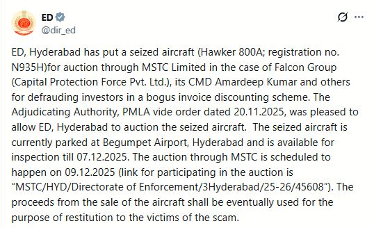 Hyderabad (Telangana) [India], December 2 : The Enforcement Directorate's (ED) Hyderabad Zonal Office on Tuesday announced the auction of a seized aircraft, Hawker 800A, through MSTC Limited.