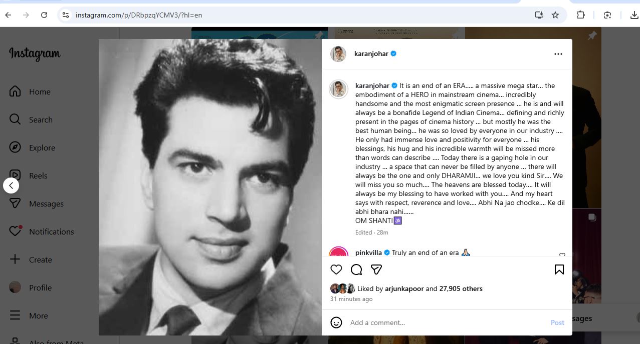 "It is an end of an ERA..... a massive mega star... the embodiment of a HERO in mainstream cinema... incredibly handsome and the most enigmatic screen presence ... he is and will always be a bonafide Legend of Indian Cinema... defining and richly present in the pages of cinema history ... but mostly he was the best human being... he was so loved by everyone in our industry ....," Karan's Instagram post read.