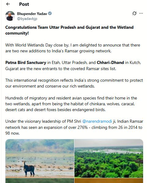 "Congratulations Team Uttar Pradesh and Gujarat and the Wetland community! With World Wetlands Day close by, I am delighted to announce that there are two new additions to India's Ramsar growing network. Patna Bird Sanctuary in Etah, Uttar Pradesh, and Chhari-Dhand in Kutch, Gujarat, are the new entrants to the coveted Ramsar sites list. This international recognition reflects India's strong commitment to protect our environment and conserve our rich wetlands. Hundreds of migratory and resident avian species find their home in the two wetlands, apart from being the habitat of chinkara, wolves, caracal, desert cats and desert foxes besides endangered birds. Under the visionary leadership of PM Shri Narendramodi