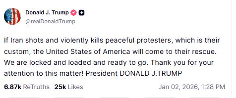 He wrote, "If Iran shots and violently kills peaceful protesters, which is their custom, the United States of America will come to their rescue. We are locked and loaded and ready to go. Thank you for your attention to this matter!"
