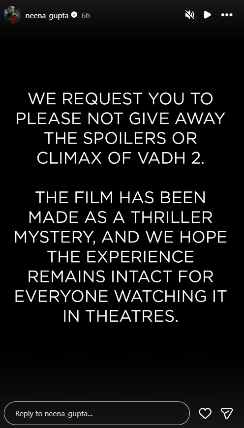 Taking to her Instagram Story, Neena wrote, "We request you to please not give away the spoilers or climax of Vadh 2. The film has been made as a thriller mystery, and we hope the experience remains intact for everyone watching it in theatres."