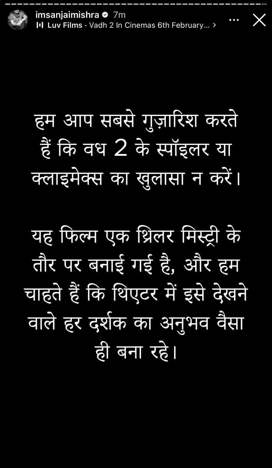 Sanjay Mishra in Hindi posted, " Hum aap sabse guzarish karte hain ki Vadh 2 ke spoiler ya climax ka khulasa na karein. Yeh film ek thriller mystery ke taur par banayi gayi hai aur hum chahte hai ki ise dekhne wale darshak ka anubhav waisa hi bana rahein."