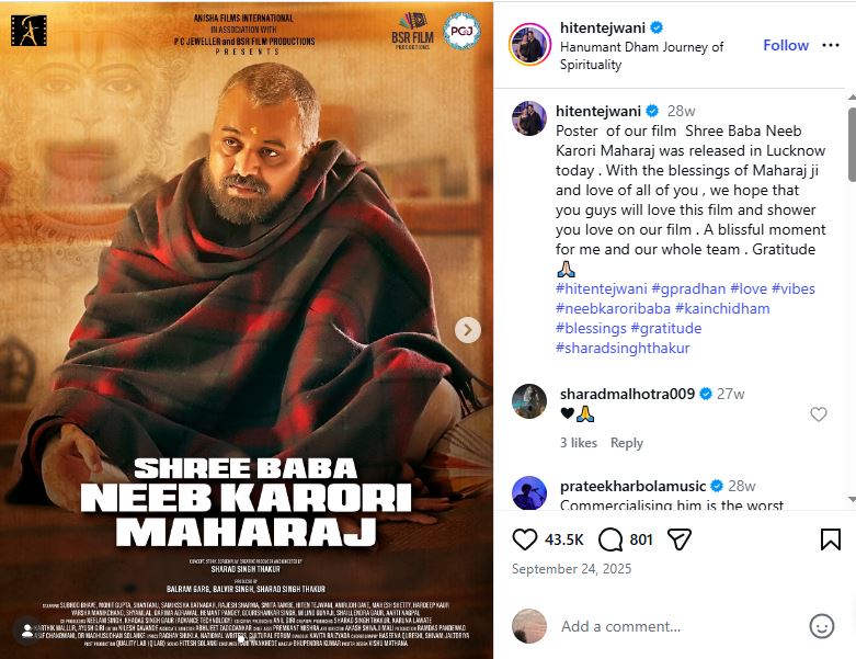 "Poster of our film Shree Baba Neeb Karori Maharaj was released in Lucknow today . With the blessings of Maharaj ji and love of all of you, we hope that you guys will love this film and shower your love on our film. A blissful moment for our whole team and me. Gratitude," he wrote.