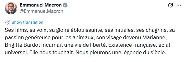 French President Macron mourns the demise of French movie icon Brigitte Bardot