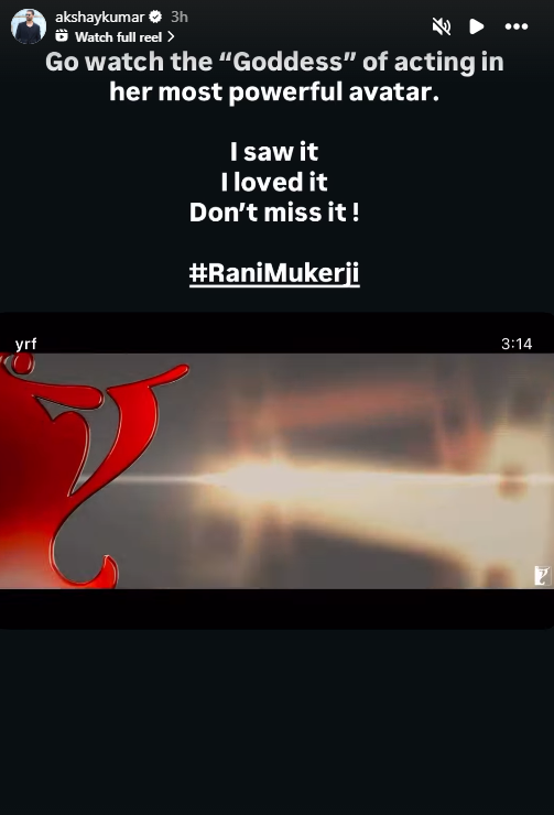 Taking to his Instagram story, Akshay shared the trailer of 'Mardaani 3' and wrote, "Go watch the Goddess of acting in her most powerful avatar. I saw, I loved it, Don't miss it! #RaniMukerji."