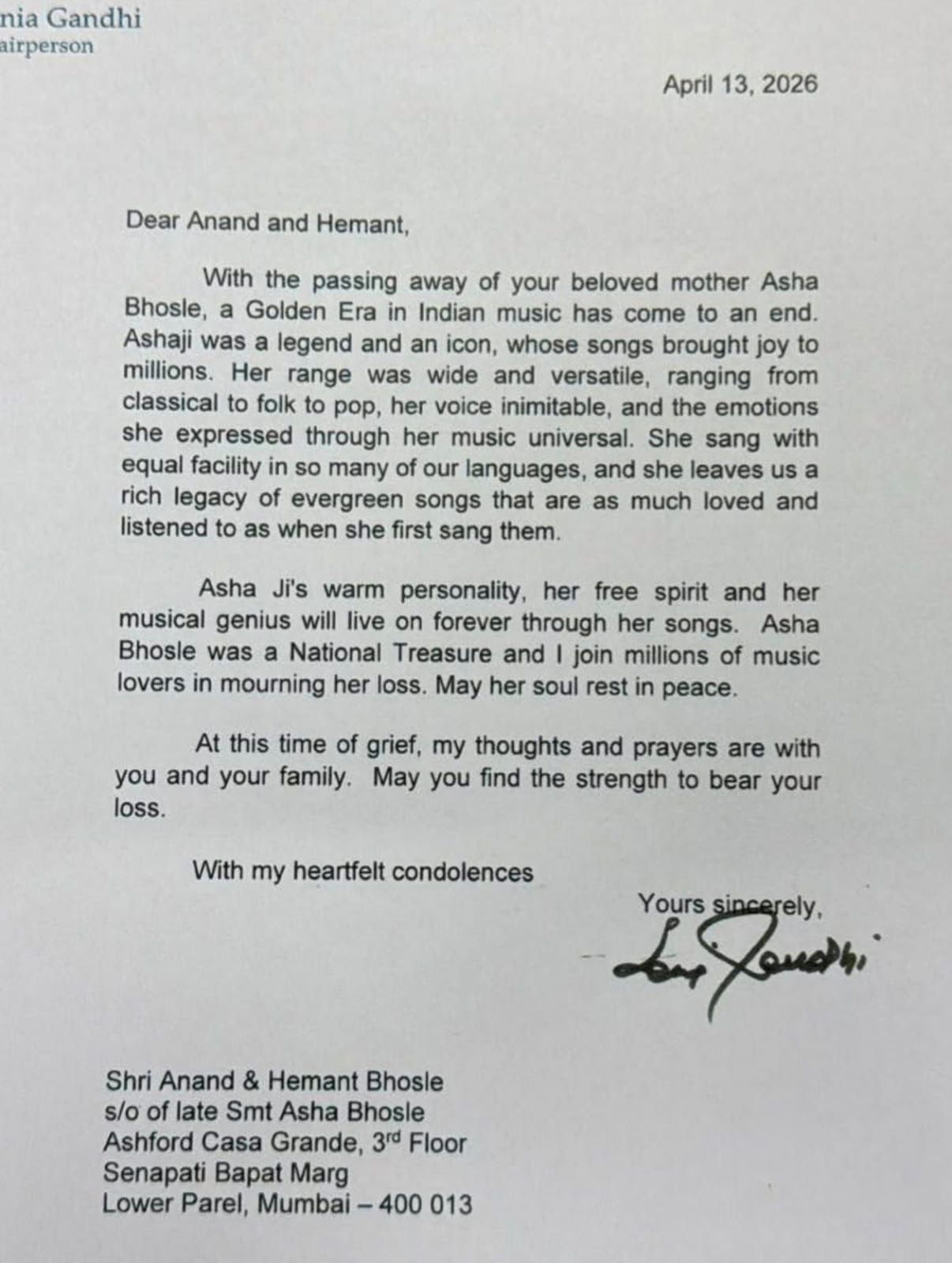 While penning the letter to her sons, Anand and late Hemant Bhosle, the Congress leader Sonia Gandhi expressed her sorrow on the passing of the legendary Indian singer. She described it as the conclusion of the "golden era" in music.