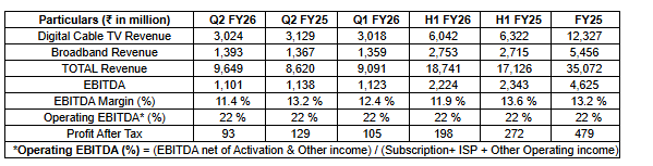 * Subscription revenue from Cable TV stood at ₹ 3,024 Mn for Q2 FY26.