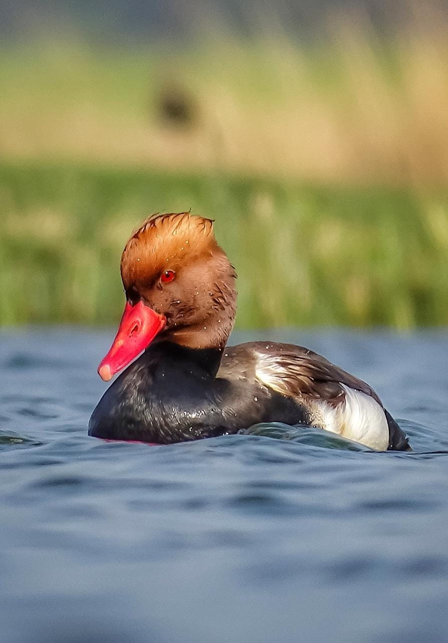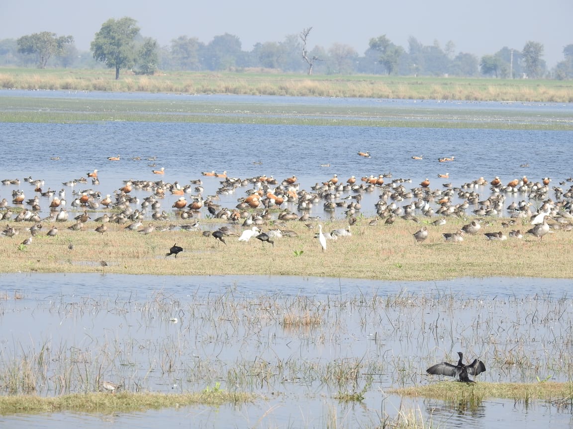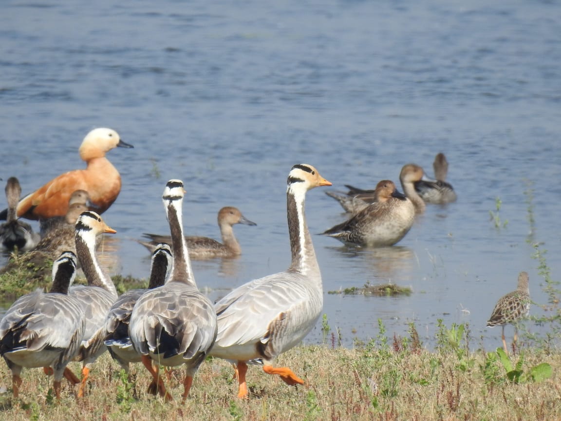 Migratory birds found in the Vadhavana wetland area include the Grey-legged Goose, Bar-headed Goose, Red-crested Pochard, Tufted Duck, White-eyed Pochard, Northern Pintail, Common Teal, Ruff, and Glossy Ibis. Resident birds include the Ruddy Shelduck, Comb Duck, Little Cormorant, Lesser Whistling Teal, Paddyfield Pipit, Cotton Teal, Black-necked Stork, and Eurasian Marsh Warbler. Rare species include the Eurasian Marsh Warbler and harriers.