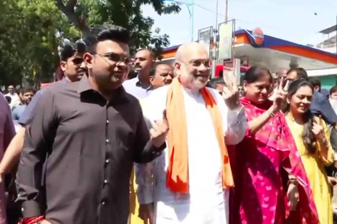 Amit Shah, along with his wife Sonal Shah, son and ICC Chairman Jay Shah, and daughter-in-law Rishita Patel, was seen showing their inked fingers after exercising their franchise.