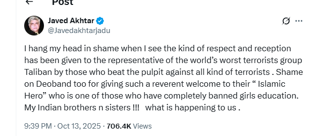 "Hang my head in shame": Javed Akhtar furious over "reverent" welcome given to Afghanistan's Foreign Minister Amir Khan Muttaqi at Deoband