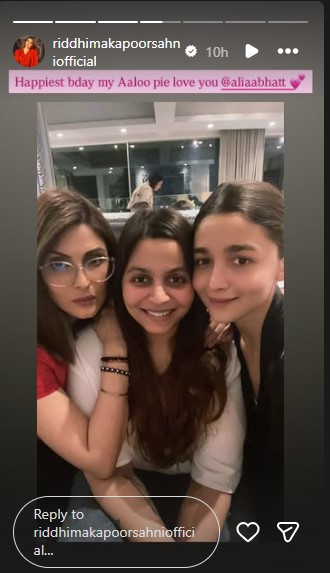 Along with the photo, Riddhima wrote a loving birthday note for Alia, affectionately calling her "Aaloo." In her message, she penned, "Happiest bday my Aaloo pie love you @aliaabhatt."