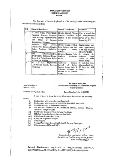 Meanwhile, Kalaramachandran, IPS (HY:1994), Additional Director General of Police (Human Rights & Litigation), Haryana, has been relieved of the additional charge of the Haryana Police Academy, Madhuban.