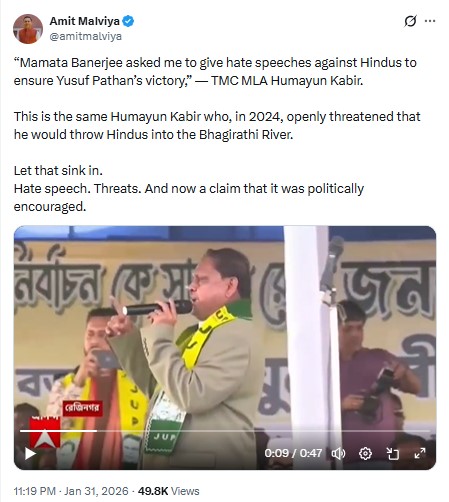 "Mamata Banerjee asked me to give hate speeches against Hindus to ensure Yusuf Pathan's victory -- TMC MLA Humayun Kabir. This is the same Humayun Kabir who, in 2024, openly threatened that he would throw Hindus into the Bhagirathi River. Let that sink in. Hate speech. Threats. And now a claim that it was politically encouraged," Malviya wrote.