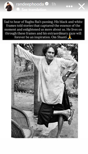 Taking to his Instagram story, Randeep wrote, "Sad to hear of Raghu Rai's passing. His black and white frames told stories that captured the essence of the moment and enlightened us more about us. He lives on through these frames and his extraordinary gaze will forever be an inspiration. Om Shanti."