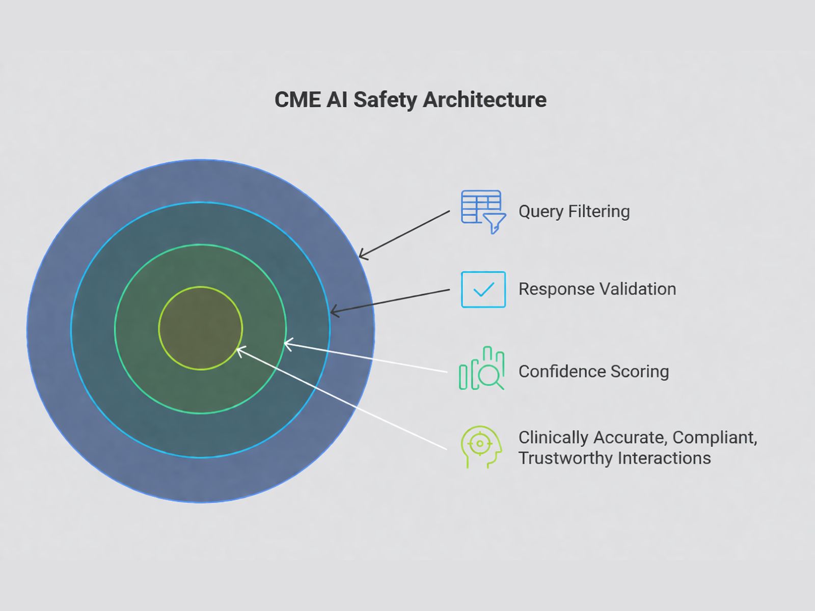 Unlike generic AI systems, this platform is purpose-built for CME, integrating a multi-layered safety architecture that: