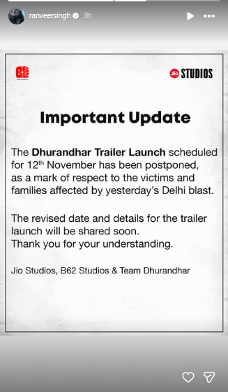 "The Dhurandhar trailer launch scheduled for 12th November has been postponed, as a mark of respect to the victims and families affected by yesterday's Delhi blast.The revised date and details for the trailer launch will be shared soon.Thank you for your understanding -- Jio Studios, B62 Studios & Team Dhurandha," a post read by Jio Studios uploaded on Ranveer's Instagram Story.