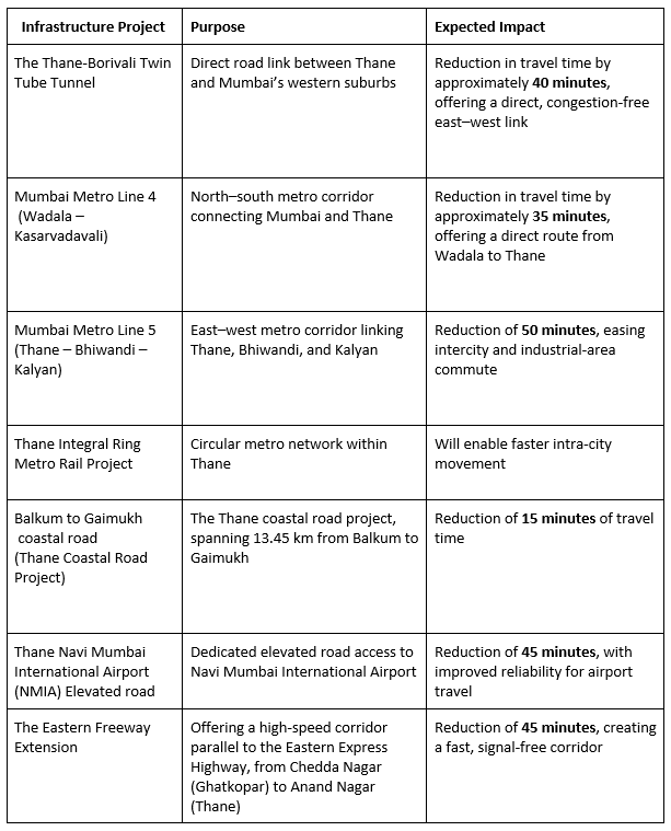 This infrastructure-led transformation of Thane aligns closely with the Government of India's Vision 2030, which focuses on building future-ready cities through integrated mobility, multi-modal transport networks, and transit-oriented urban development. Under this vision, large-scale investments in metros, highways, expressways, and airport corridors are intended to reduce congestion, improve commute reliability, and support decentralised urban growth across the Mumbai Metropolitan Region. Projects such as Metro Routes 4 and 5, the Thane-Borivali Twin Tube Tunnel, and the Thane-Navi Mumbai International Airport (NMIA) Elevated Road reflect this broader national objective creating cities where infrastructure planning directly improves everyday mobility, economic access, and long-term liveability for residents.