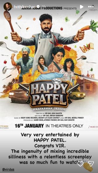"Very very entertained by HAPPY PATEL. Congrats VIR. The ingenuity of mixing incredible silliness with a relentless screenplay was so much fun to watch!" the 'War 2' star wrote.