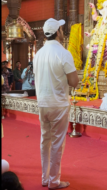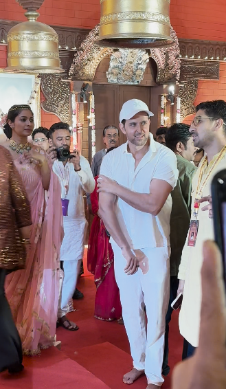 Ditching ethnic attire, Hrithik arrived at the pandal in casual wear. He looked extremely cool in a white shirt that he paired with matching pants and a white cap.