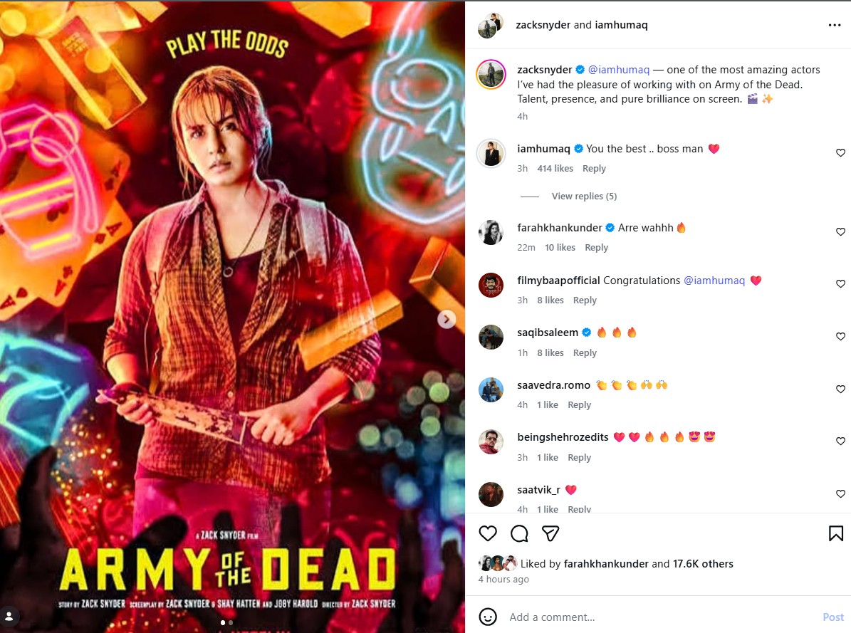Calling Huma an "amazing" actor, Zack wrote, "@iamhumaq -- one of the most amazing actors I've had the pleasure of working with on Army of the Dead. Talent, presence, and pure brilliance on screen."
