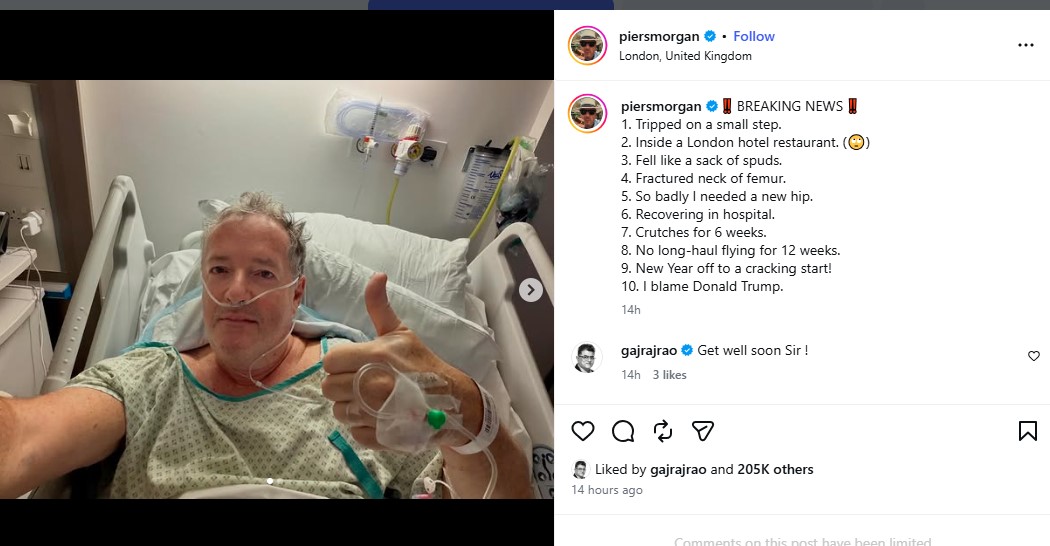 "I Blame Donald Trump," jokes Piers Morgan as he shares health update after fall at London restaurant