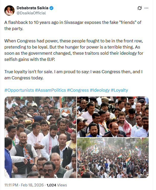 In a post on X, Saikia said, "A flashback to 10 years ago in Sivasagar exposes the fake "friends" of the party. When Congress had power, these people fought to be in the front row, pretending to be loyal. But the hunger for power is a terrible thing. As soon as the government changed, these traitors sold their ideology for selfish gains with the BJP. True loyalty isn't for sale. I am proud to say: I was Congress then, and I am Congress today."