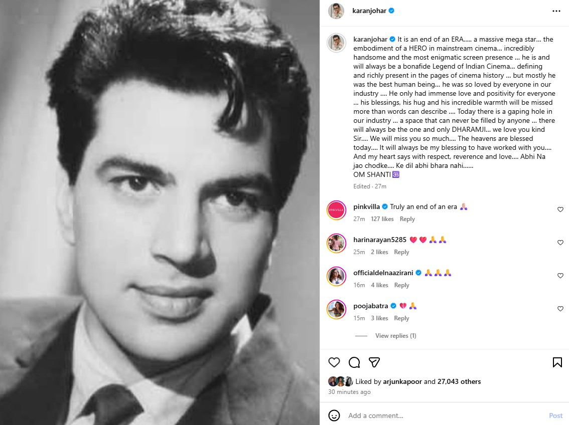 "It is an end of an ERA..... a massive mega star... the embodiment of a HERO in mainstream cinema... incredibly handsome and the most enigmatic screen presence ... he is and will always be a bonafide Legend of Indian Cinema... defining and richly present in the pages of cinema history ... but mostly he was the best human being... he was so loved by everyone in our industry ....," Karan's Instagram post read.