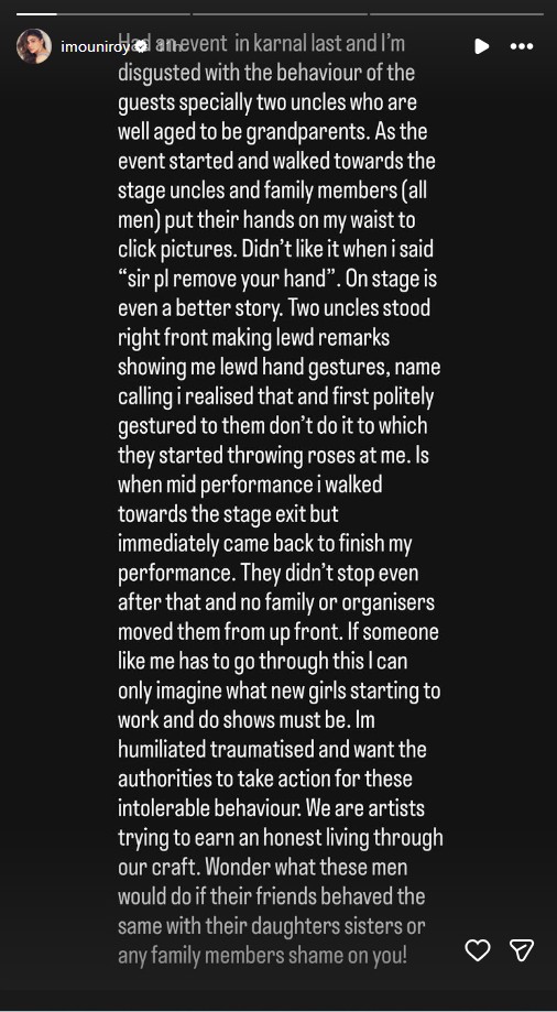 According to Mouni, when she initially tried to handle the situation calmly, the behaviour escalated. "I realised that and first politely gestured to them not to do it, to which they started throwing roses at me. It was when, mid-performance, I walked towards the stage exit but immediately came back to finish my performance. They didn't stop even after that, and no family members or organisers moved them from up front. If someone like me has to go through this, I can only imagine what new girls starting to work and do shows must face. I'm humiliated, traumatised, and want the authorities to take action for this intolerable behaviour."