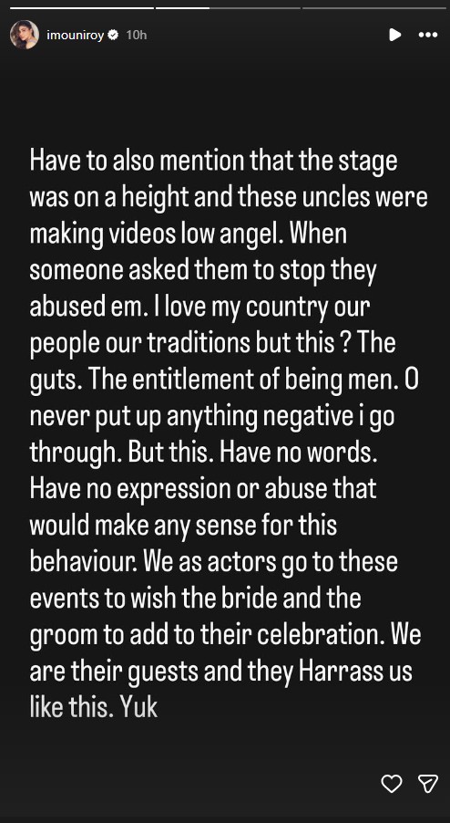 In another Instagram story, Mouni mentioned, "Have to also mention that the stage was on a height and these uncles were making videos low angle. When someone asked them to stop, they abused them."