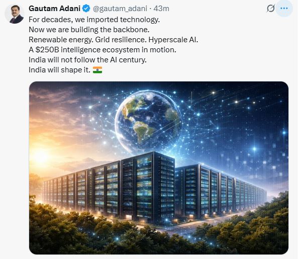 In a post on Twitter, he said, Renewable energy. Grid resilience. Hyperscale AI. A $250B intelligence ecosystem in motion. India will not follow the AI century. India will shape it.