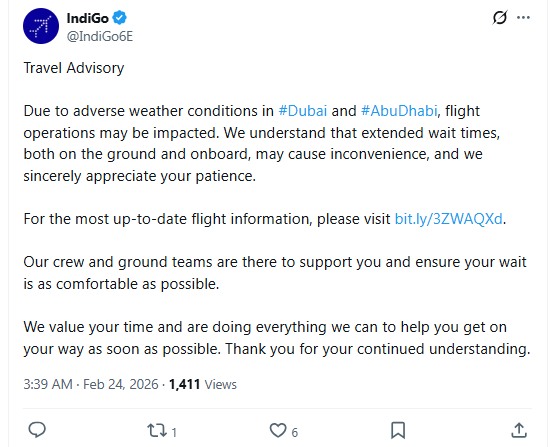 IndiGo has requested travellers to monitor their real-time flight status through official digital channels as the local weather in Dubai remains unpredictable with lingering haze and fog.