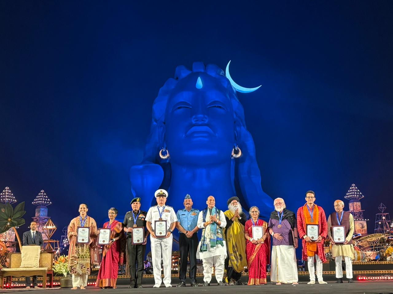 On this occasion, Defence Minister Rajnath Singh, with Sadguru Jaggi Vasudev, presented Bavya Bharat Bhushan Awards Medals and certifications to dignitaries on behalf of Isha Foundation. The awards were conferred on Air Marshal Jithendra Mishra of the Western Air Command and Admiral Rahul Vikas Khokle of the Western Naval Command for Operation Sindoor. Other awardees included Artist Dr N.Rajan, Dancer Alamel Valli, Rocket Scientist Dr Nambi Narayanan, Former Chairman of ISRO A.S.Kiran Kumar, Academician Vikram Sampath and Badminton Player Saina Nehwal.
