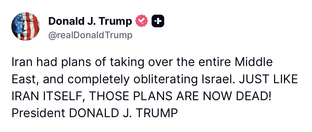 In a Truth Social Post, Trump said, "Iran had plans of taking over the entire Middle East, and completely obliterating Israel. JUST LIKE IRAN ITSELF, THOSE PLANS ARE NOW DEAD!"