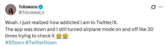 "Woah. I just realized how addicted I am to Twitter/X. The app was down and I still turned airplane mode on and off like 30 times trying to check it," another netizen posted on X.