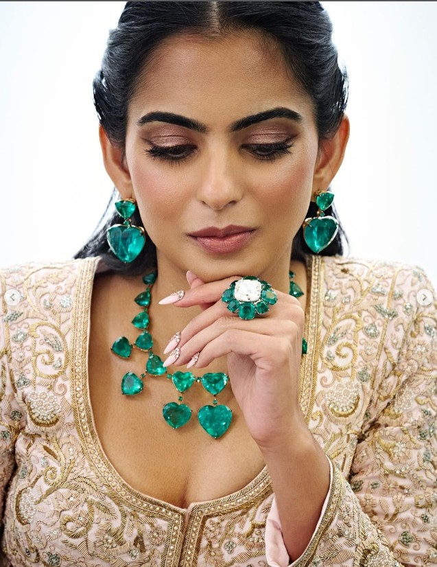 Isha complemented her look with emerald jewels from her mother's collection, including a statement necklace, earrings, and a ring.