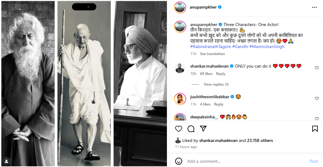 Notably, on Thursday, Kher took to Instagram and shared a collage featuring his pictures of his look as Rabindranath Tagore, Mahatma Gandhi, and Manmohan Singh.