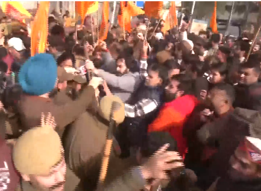 As the police tried to control the protesters, gathered in large numbers, a scuffle erupted between the two sides.