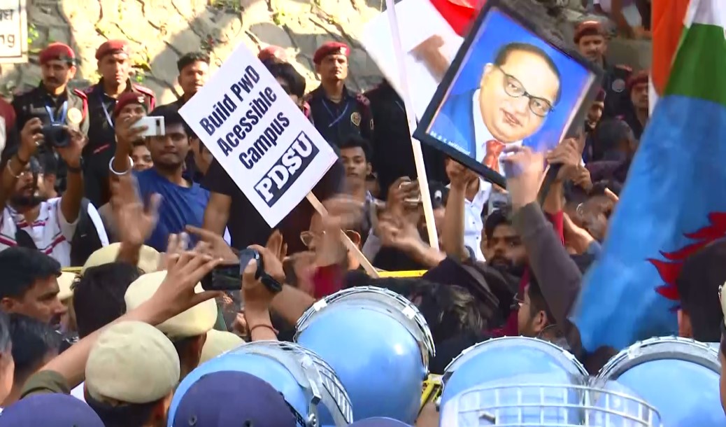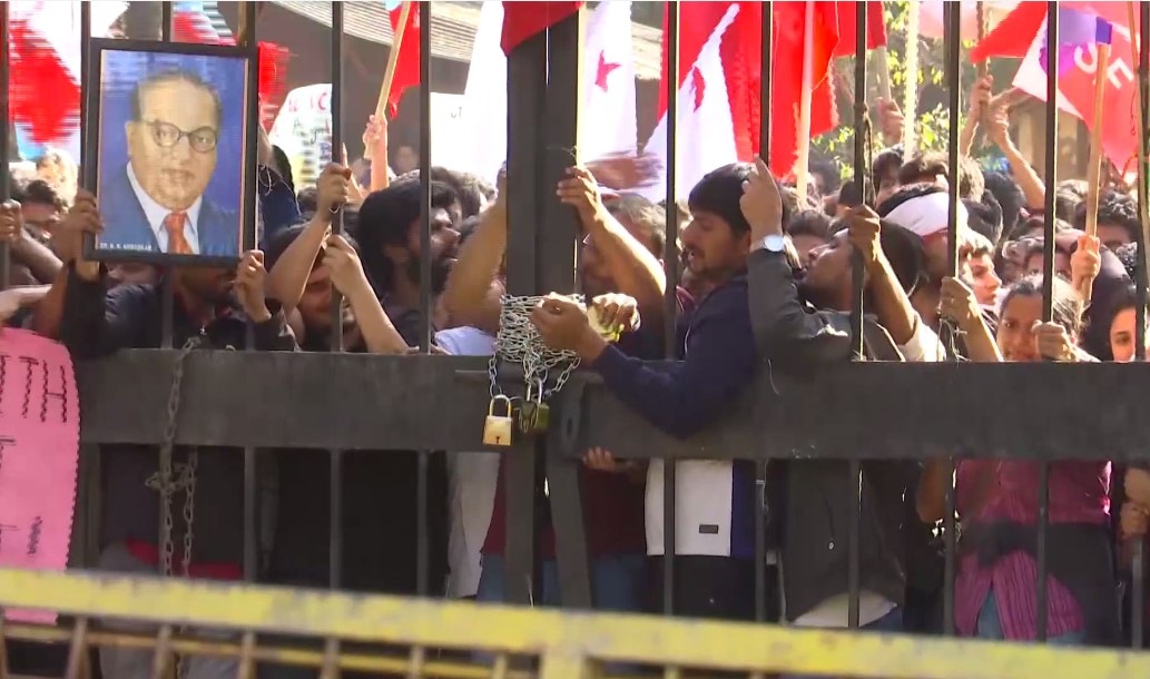 Enraged protestors, comprising JNUSU and left-affiliated student groups, including AISF, SFI, PDSU and NSUI carried posters, flags of the federation and portraits of B R Ambedkar and tried to break free the locks.